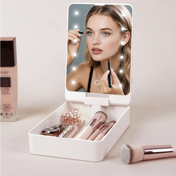 กระจกแต่งหน้าไฟ LED แบบพกพาชาร์จไฟ USB พร้อมคุณสมบัติส่วนตัวกล่องแปรงเครื่องสำอางสีชมพูสองด้าน